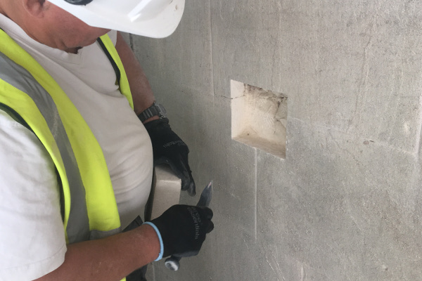 Stonemason Jim shows us the new stoneworks, replacing the damaged stone caused by corroded iron
