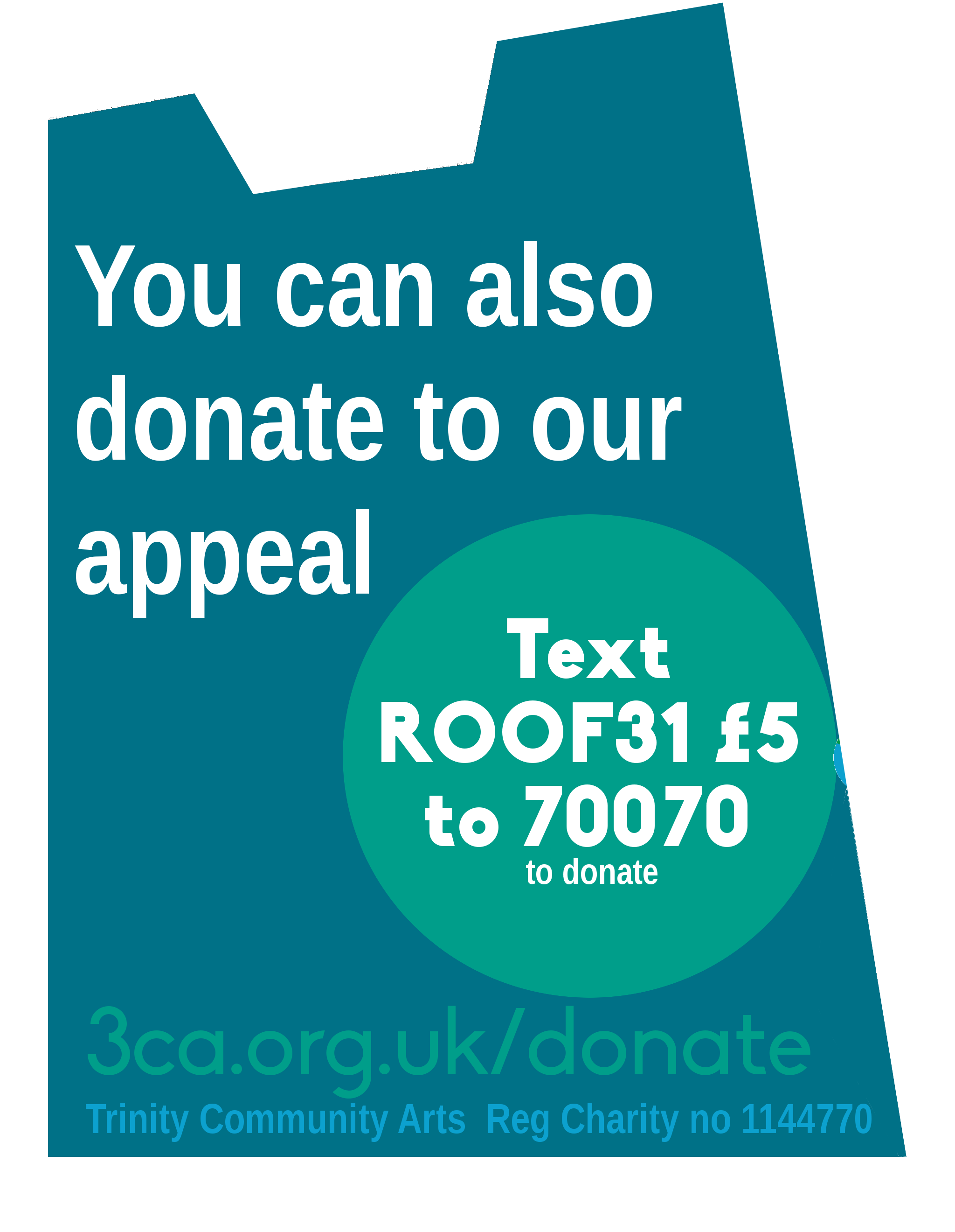 We still need help in raising the remaining 20% needed to complete the repairs. You can pledge your support via Trinity’s Just Giving page: visit www.3ca.org.uk/donate for more info, donate by Text Giving with ROOF 31 and your donation amount to 70070, download the Trinity Anthem or buy some of our merch from our marketplace.